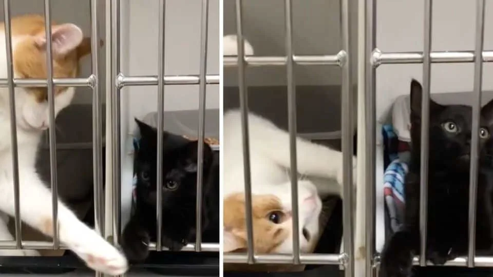 Two cats in side-by-side kennels had pressed themselves close to the bars, their paws reaching through the gaps in a desperate attempt to touch one another.
