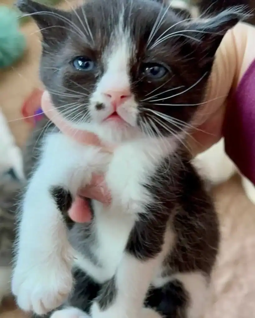 Three tabby babies and two tuxedo babies pressed against her, their cries small but strong.