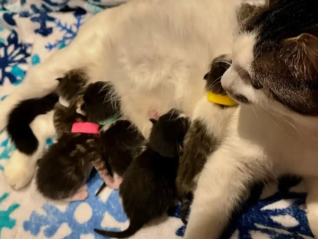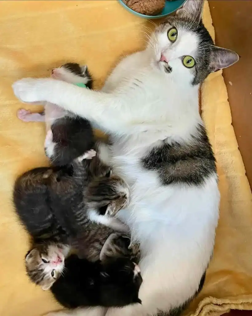 One by one, five tiny kittens slipped into the world, blind and wet, searching for her warmth.