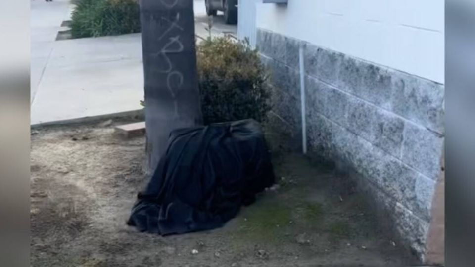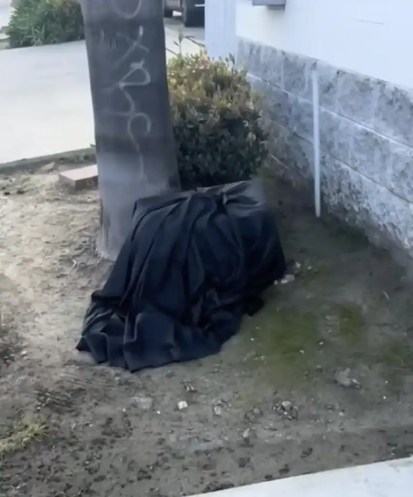 Beneath a large tree sat a black blanket, heavy with rainwater, folded oddly over what looked like a shape underneath.