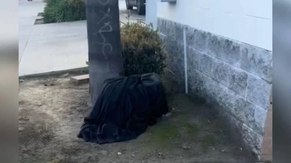 Beneath a large tree sat a black blanket, heavy with rainwater, folded oddly over what looked like a shape underneath.